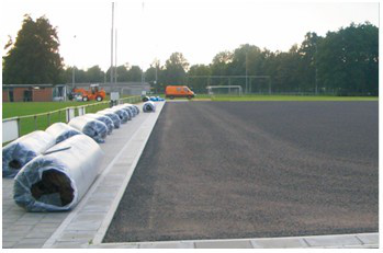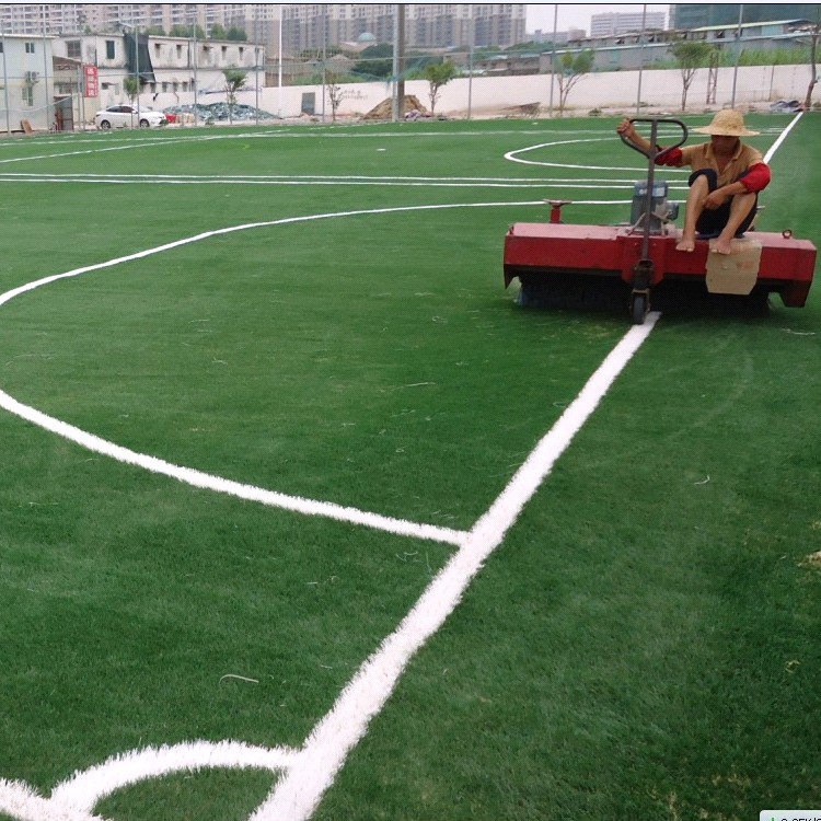 草皮全部處理完畢后,開始注砂、注膠粒。按不同草高的(公斤/平方米)注砂數(shù),將石英砂均勻的攤鋪到規(guī)定區(qū)域內(nèi)。填充石英砂完成后,用刷草機(jī)縱橫梳理草纖各一次,橡膠粒的填充方式一樣,橡膠粒完畢后,再縱橫梳理一次。
