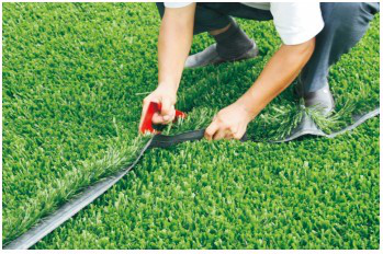 將綠色草皮各接縫處搭接2-3厘米,用裁草推刀從搭接處中央切開,使兩邊的草皮盡可能搭接緊湊,然后以裁紙刀進(jìn)行修剪;將20或30厘米寬的連接帶沿草皮接縫處鋪開,放入草皮下面,盡量使草皮的接縫位于連接帶的中央,然后將膠水用橡皮刮板均勻地涂刮在連接帶上,再把兩邊的草皮拼合,膠粘于連接帶上。如果拉直后拼合處縫隙較大,可在此處隔2-5厘米割開一道,向接口處拉伸,以確保外形美觀;